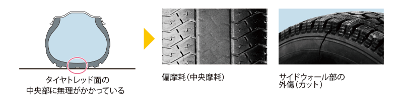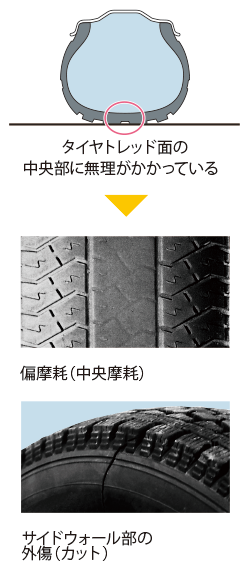 空気圧が不足すると、タイヤの負荷能力は低下します。また、タイヤ各部の動きが大きくなるためタイヤが異常発熱し、その熱によりコードやゴムが劣化して、次のような損傷や現象を起こしやすくなります。