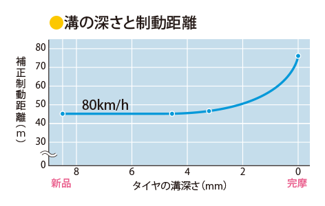 ⑤ タイヤの制動性能は、車両の走行速度、路面状況、残り溝深さ及びカテゴリー(夏用タイヤ、冬用タイヤ等)により異なります。