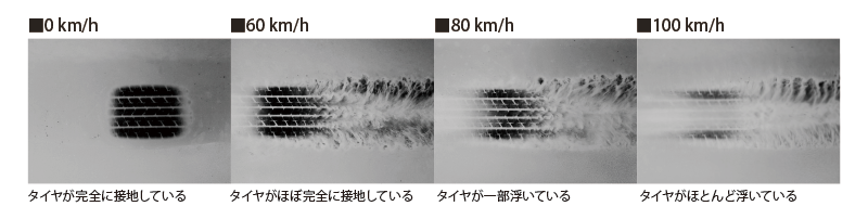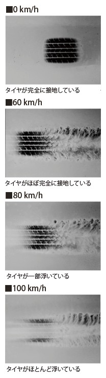 すり減ったタイヤを装着し、濡れた道路を走行してハイドロプレーニング(タイヤの水上滑走現象)の実験をしました。下の写真はガラス板越しにタイヤ接地部を真下から撮影したものです。