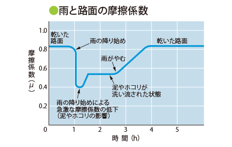雨の降り始めの道路は上図のように滑りやすくなっています。