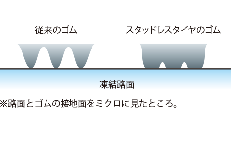 低温でも“しなやかさ”を失わない特殊配合ゴムを使用し、タイヤの溝の形状等新たな工夫を加え、凍結路における走行性能をできるだけ高めています。