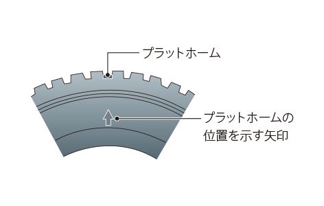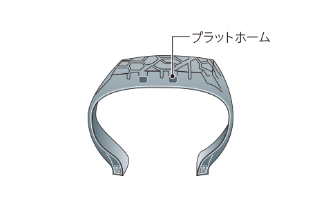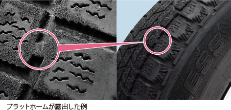 日本国内における道路交通法施行細則等によって定められた冬用タイヤとしての使用限度を示すために、接地部の溝に設けられている目印。タイヤがすり減って残り溝が新品時の50%になると溝が途切れこの目印が現れます。(一部プラットホームが無いタイヤもあります。)