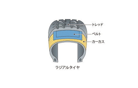 カーカスを構成するコードがトレッドの中心線に対して90°またはそれに近い角度(放射状=ラジアル)に配列され、またトレッドの部分をベルト(補強帯)で締付けているタイプのタイヤをいいます。ラジアルタイヤは、バイアスタイヤに比べ次のような特徴があります。