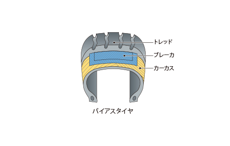 カーカスを構成するコードがトレッドの中心線に対して斜め(バイアス)に配列され、お互いに交差するような構造をもつタイプのタイヤをいいます。なお、ブレーカの入っているタイプと入っていないタイプとがあります。
