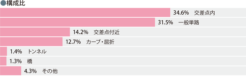 一般に無理をしがちな交差点内での事故が第1位。交差点内では、特に他の車両やバイク、歩行者の動きにご注意下さい。
