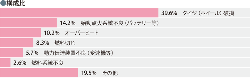 タイヤ(ホイール)破損が第1位。日常点検を必ず励行して下さい。特に高速走行時には空気圧のチェックを忘れずに。