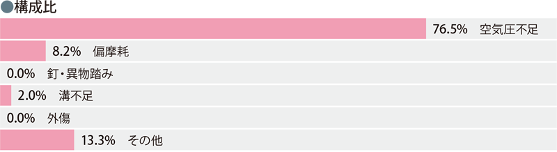 乗用車では空気圧不足が76.5%で第1位。日常点検・定期点検を実施し、適正使用に努めましょう。