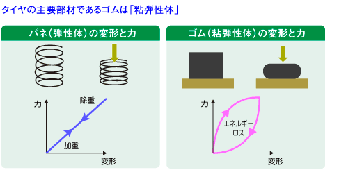 理想的なバネ(弾性体)は加えた⼒がバネに保存され、バネを解放すれば、加えられた⼒がそのまま戻ってくるため、エネルギーはロスしないことになります。 ⼀⽅、ゴム(粘弾性体)に加えられた⼒は、変形により熱に変換されエネルギーを消費してしまいます。つまり、ゴムを変形させるとエネルギーロスが発生します。