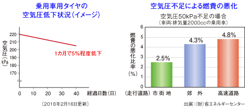 タイヤは充てんされた空気の自然漏えいにより空気圧が徐々に低下します。使用条件等によって差異があり一定ではありませんが、1ヶ月で5%程度低下します。 環境・安全の両面から最低1ヶ月に1度は適正な空気圧を調整・維持して下さい。