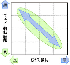 一般的な転がり抵抗とウェット制動距離の相関関係については、タイヤの転がり抵抗を低減(良く)すれば、濡れた路面での制動距離は伸び(悪化)、つまり背反の傾向にあります。