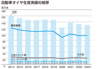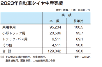 乗用車用は6.1%減、小形トラック用は前年比4.9%減、トラック・バス用は前年比5.6%減と各品種とも前年を下回りました。