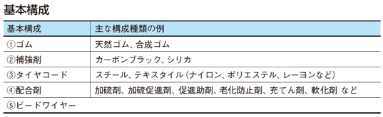 | ③タイヤコード | スチール、テキスタイル(ナイロン、ポリエステル、レーヨンなど) |