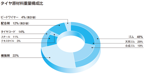 自動車タイヤは①ゴム②補強剤③タイヤコード④配合剤⑤ビードワイヤー等100種類を超える原材料で構成されています。タイヤ原材料重量の構成割合はタイヤの品種によって異なりますが、約半分がゴム(天然ゴム29%、合成ゴム18%)から構成され、次いで補強剤25%、タイヤコード13%の順となっています。