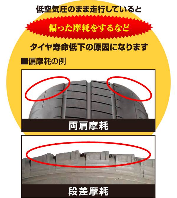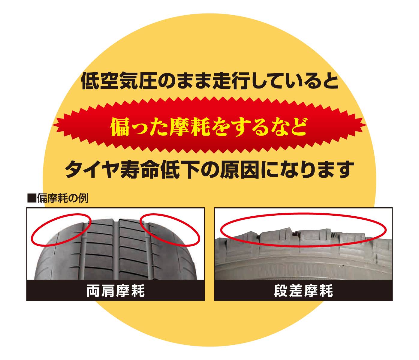また、偏摩耗やその他のタイヤ損傷を引き起こし、タイヤ寿命を縮める原因となります。
