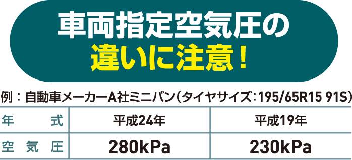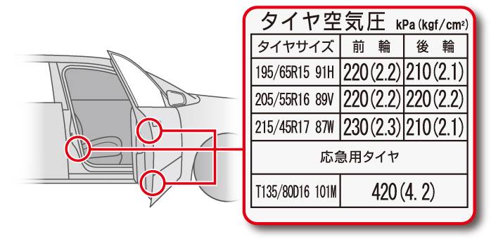 同じ車種でも、年式、型式、タイヤサイズによって車両指定空気圧が異なる場合があります。必ず確認して下さい。