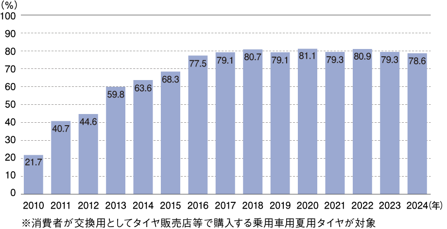 2010年から低燃費タイヤ等のラベリング制度をスタートしました。その後、普及が進み、近年では8割の水準に至っています。