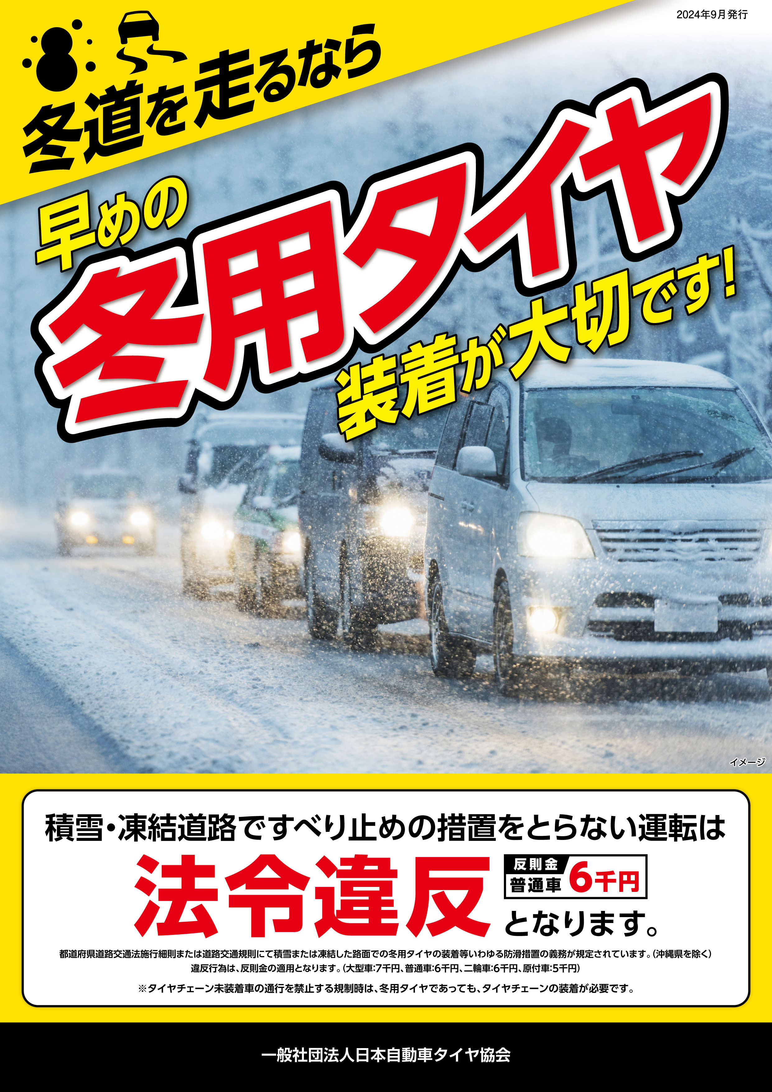 積雪又は凍結している道路において自動車を運転するときは、タイヤチェーン又はスノータイヤを取り付けるなど有効な滑り止めの措置を講ずること。