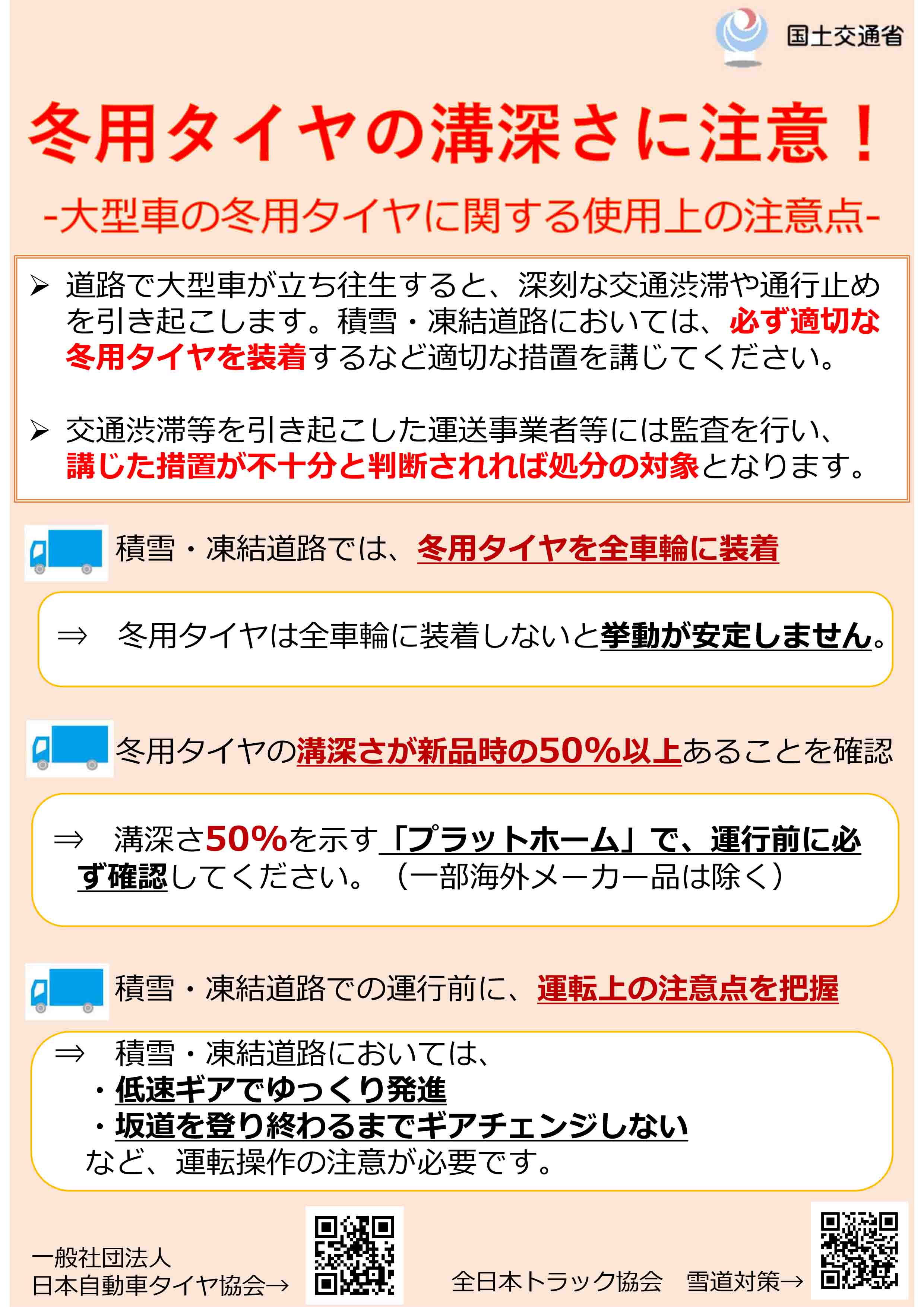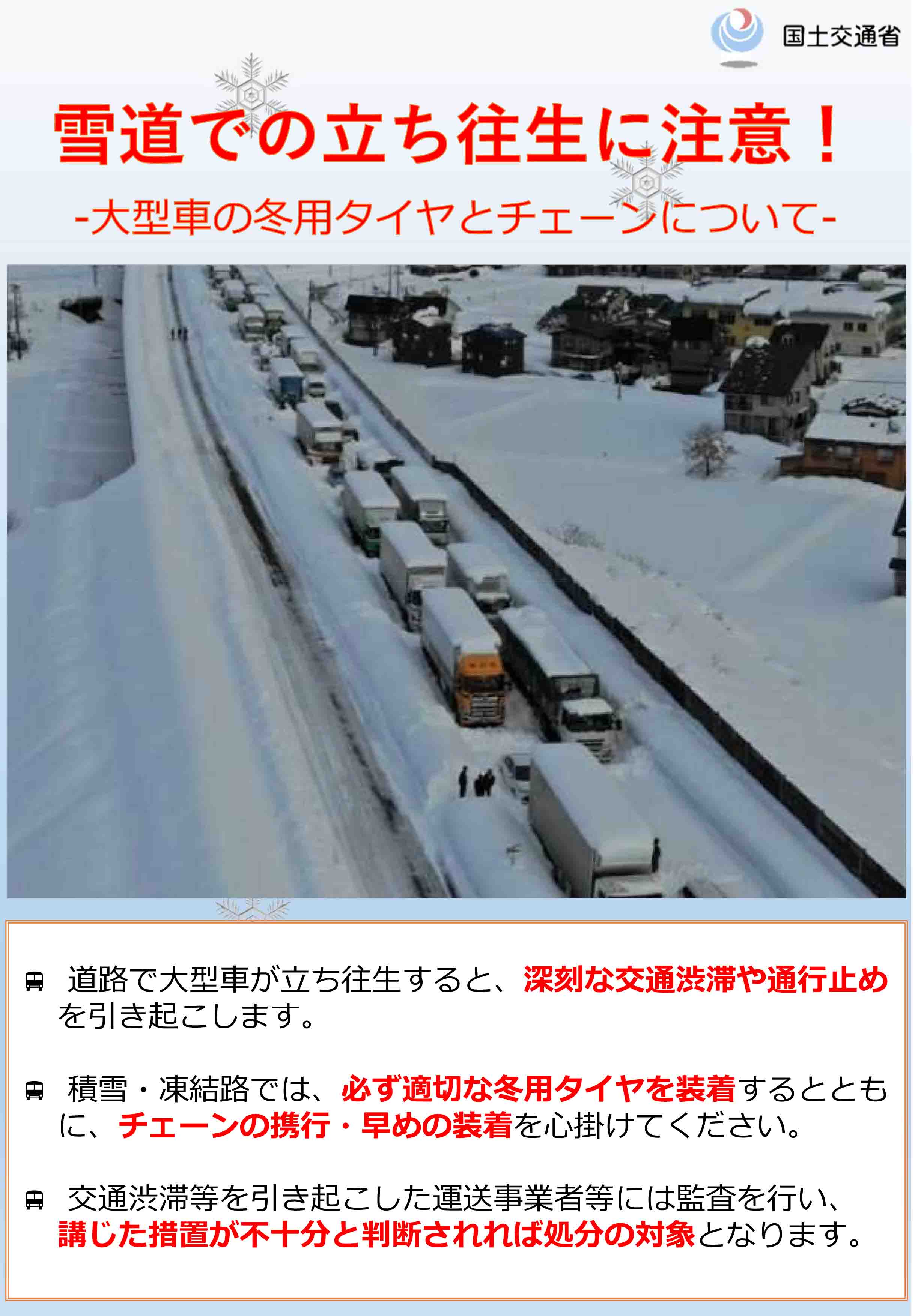積雪又は凍結している道路において、自動車(小型特殊自動車を除く。)又は原動機付自転車を運転するときは、スノー・タイヤ(接地面の突出部が50パーセント以上摩耗していないものに限る。)を全車輪に装着し、又はタイヤ・チエンを取り付ける等効果的な滑り止めの措置を講ずること。